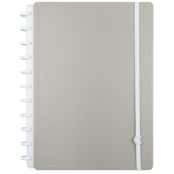 ? A5, Médio ou Grande: Capa e contracapa rígidas, 01 folha de adesivos, 01 bolsa plástica, 01 folha de instrução de uso e manuseio, com refis e acessórios da marca disponíveis no verso, 01 folha de identificação com calendário no verso, 04 divisórias com abas para identificação (02 pretas e 02 transparentes), 80 folhas offset 90g (60 folhas pautadas e 20 folhas lisas brancas para impressão), 01 suporte com elástico para 01 caneta ou 01 lápis e discos M + elástico.