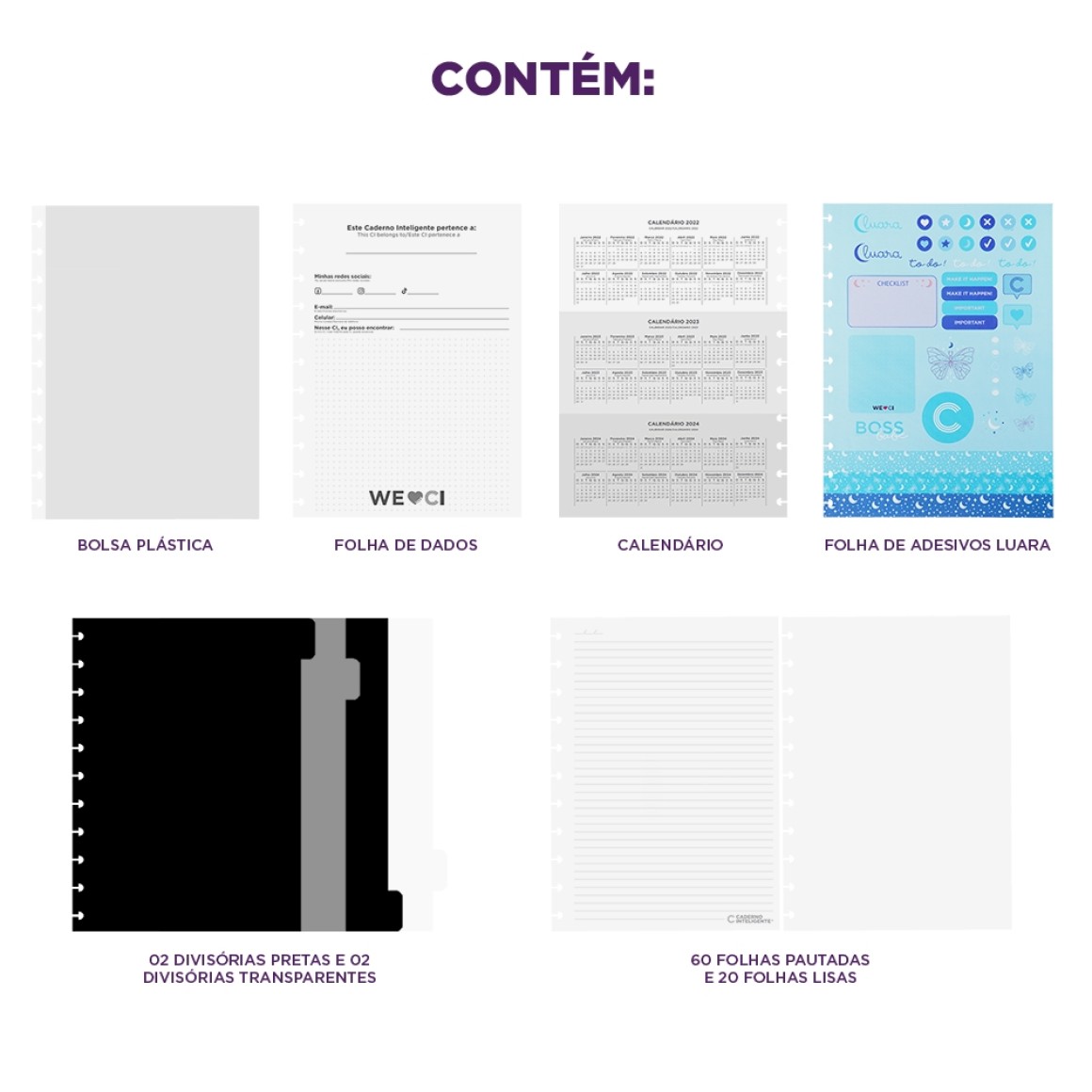 ? A5, Médio e Grande: Capa e contracapa rígidas, 01 folha de adesivos, 01 bolsa plástica, 01 folha de instrução de uso e manuseio, com refis e acessórios da marca disponíveis no verso, 01 folha de identificação com calendário no verso, 04 divisórias com abas para identificação (02 pretas e 02 transparentes), 80 folhas offset 90g (60 folhas pautadas e 20 folhas lisas brancas para impressão) e 01 suporte com elástico para 01 caneta ou 01 lápis.