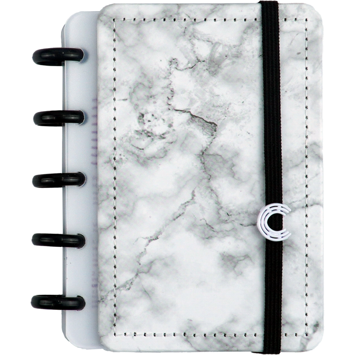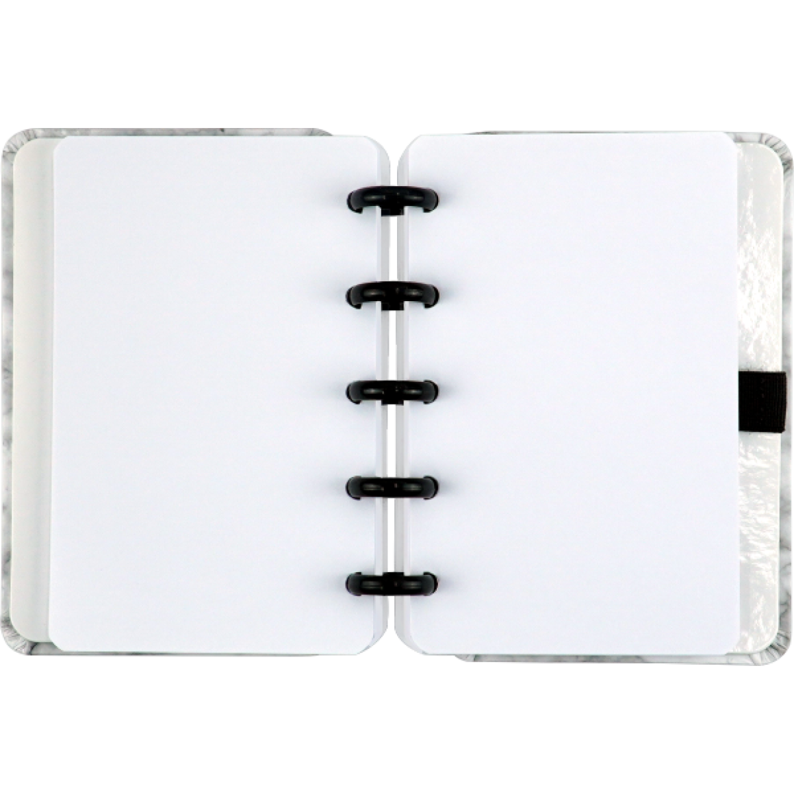 ? A5, Médio ou Grande: Capa e contracapa rígidas, 01 bolsa plástica, 01 folha de instrução de uso e manuseio, com refis e acessórios da marca disponíveis no verso, 01 folha de identificação com calendário no verso, 04 divisórias com abas para identificação (02 pretas e 02 transparentes), 80 folhas offset 90g (60 folhas pautadas e 20 folhas lisas brancas para impressão), 01 suporte com elástico para 01 caneta ou 01 lápis e discos M + elástico.