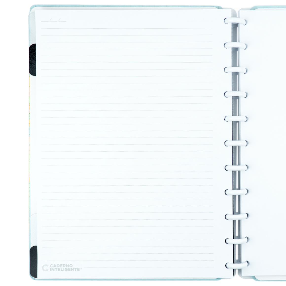 Disponível nos tamanhos Grande e A5 e com acabamento em verniz localizado, ele é ideal para uso escolar, como um caderno de anotações e também como um planner. Com o incrível sistema de discos, o Caderno Inteligente® é um caderno totalmente personalizável, que permite que você tire e adicione folhas quando quiser, adicionando muito mais versatilidade e personalidade para o seu caderno.