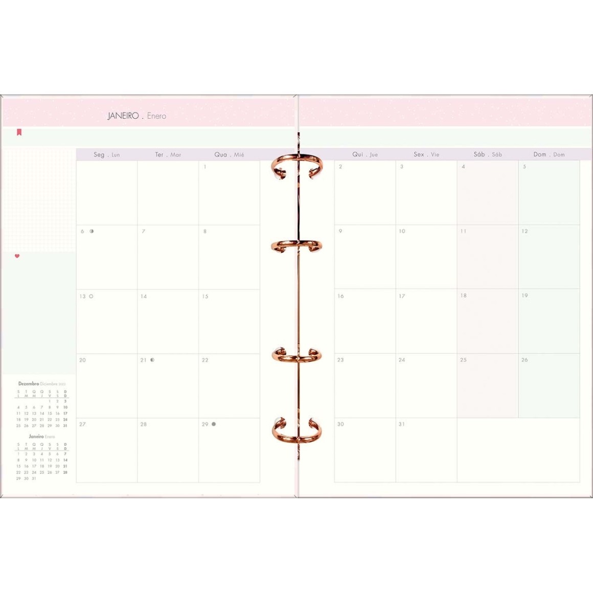 O Planner Argolado 17,7 x 24 cm Soho 90 G 2025 pode ser usado para organizar os compromissos do dia a dia em casa, no trabalho e na escola. Com formato compacto, leve e bastante funcional, tem capa dura com detalhe metalizado, folha de adesivos e bolsa plástica. O miolo deste produto conta com 88 folhas em papel creme, gramatura 90 g/m², com visões anual, mensal e semanal, além de páginas para anotações.