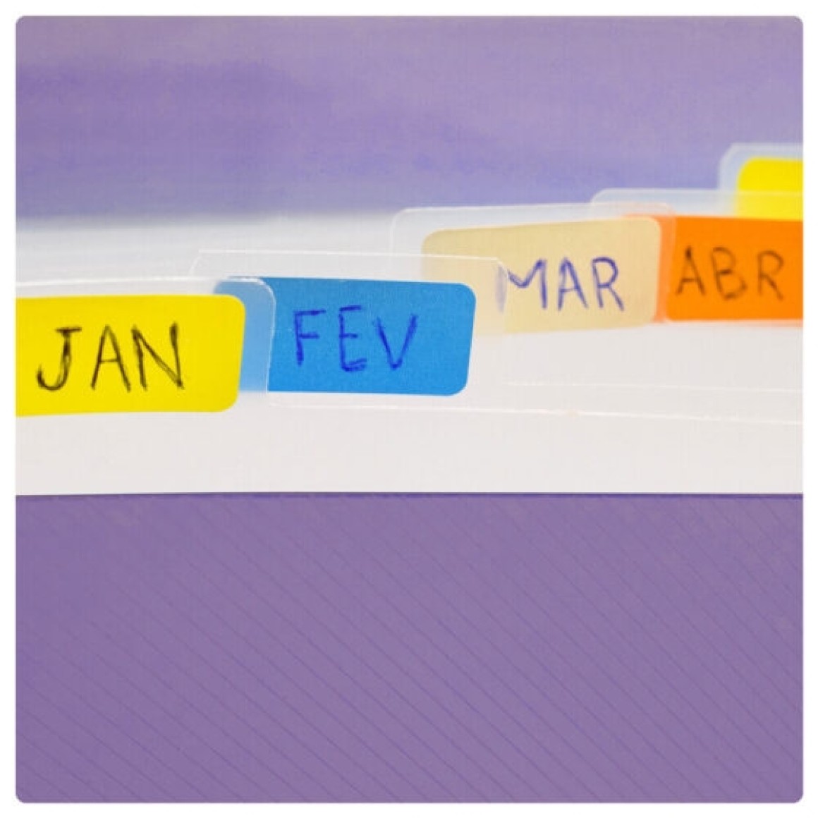 Organize seus documentos com mais praticidade. Esta pasta sanfonada é ideal para usar em necessidades anuais pois conta com 12 divisões, exatamente um espaço para cada mês do ano, ou pode separar por ordem alfabética, numérica, por assunto de importância ou qualquer ordem lógica, que podem ser identificadas com as etiquetas coloridas.