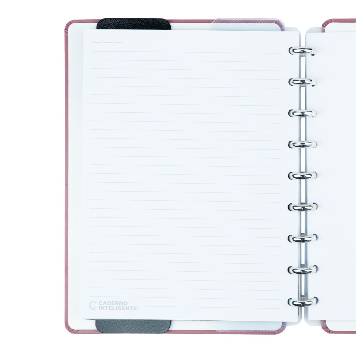 ? A5, Médio ou Grande: Capa e contracapa rígidas, 01 folha de adesivos, 01 bolsa plástica, 01 folha de instrução de uso e manuseio, com refis e acessórios da marca disponíveis no verso, 01 folha de identificação com calendário no verso, 04 divisórias com abas para identificação (02 pretas e 02 transparentes), 80 folhas offset 90g (60 folhas pautadas e 20 folhas lisas brancas para impressão), 01 suporte com elástico para 01 caneta ou 01 lápis e discos M + elástico.