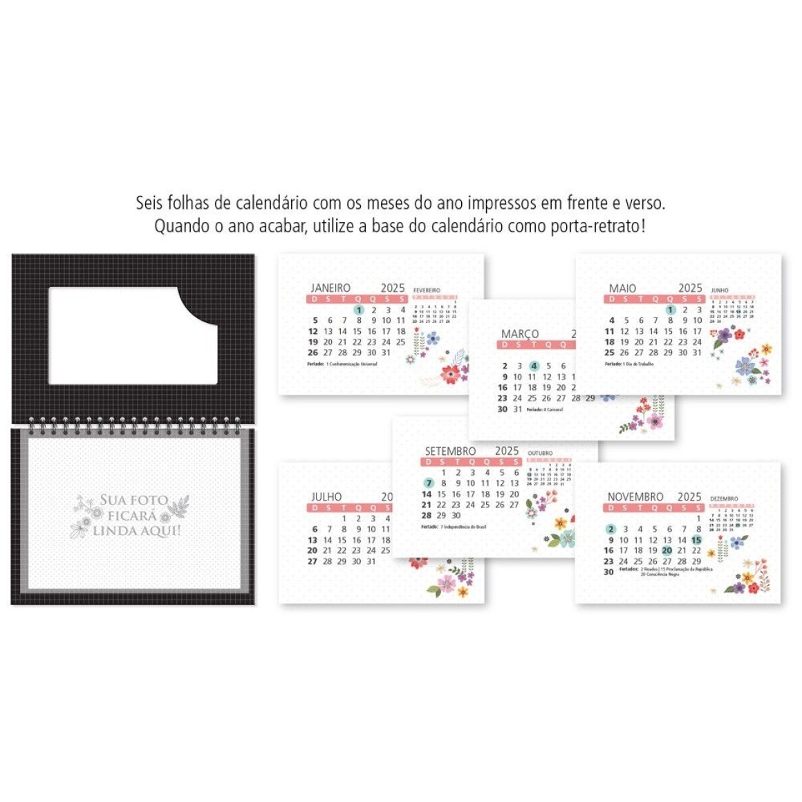Para o seu ano ficar ainda mais bonito! Calendário de mesa e porta retrato no mesmo produto! Formato 13x18,5cm, encadernação wire-o e recorte especial na frente. Depois que o ano acabar, use a base como um lindo porta retrato!
