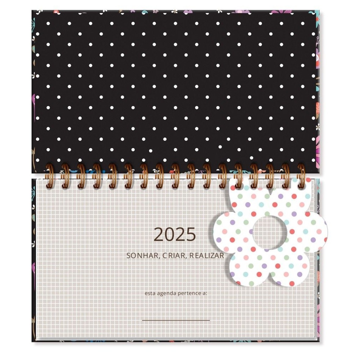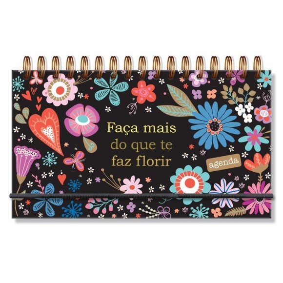 Agenda semanal, capa dura, miolo com 128 páginas (64 folhas), formato 8,5x15cm, papel offset 75g, acabamento wire-o, texto impresso em hot stamp dourado, elástico para fechamento. Acompanha marcador de páginas.