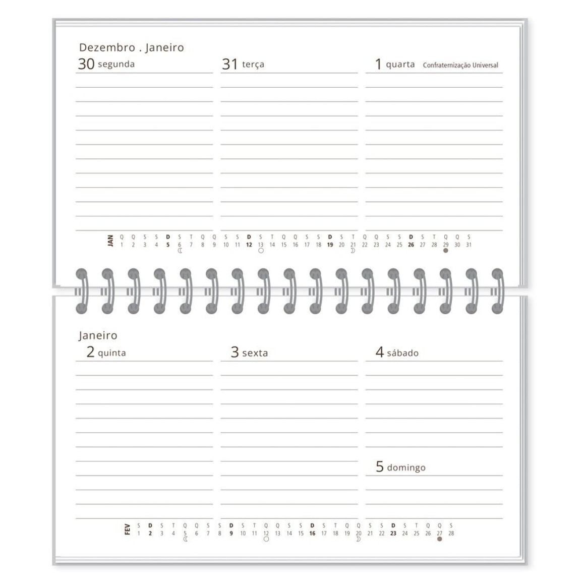 Agenda semanal, capa dura, miolo com 128 páginas (64 folhas), formato 8,5x15cm, papel offset 75g, encadernação wire-o e elástico para fechamento. Impressa em papel kraft e possui frase em hot stamp dourado. Acompanha marcador de páginas.
