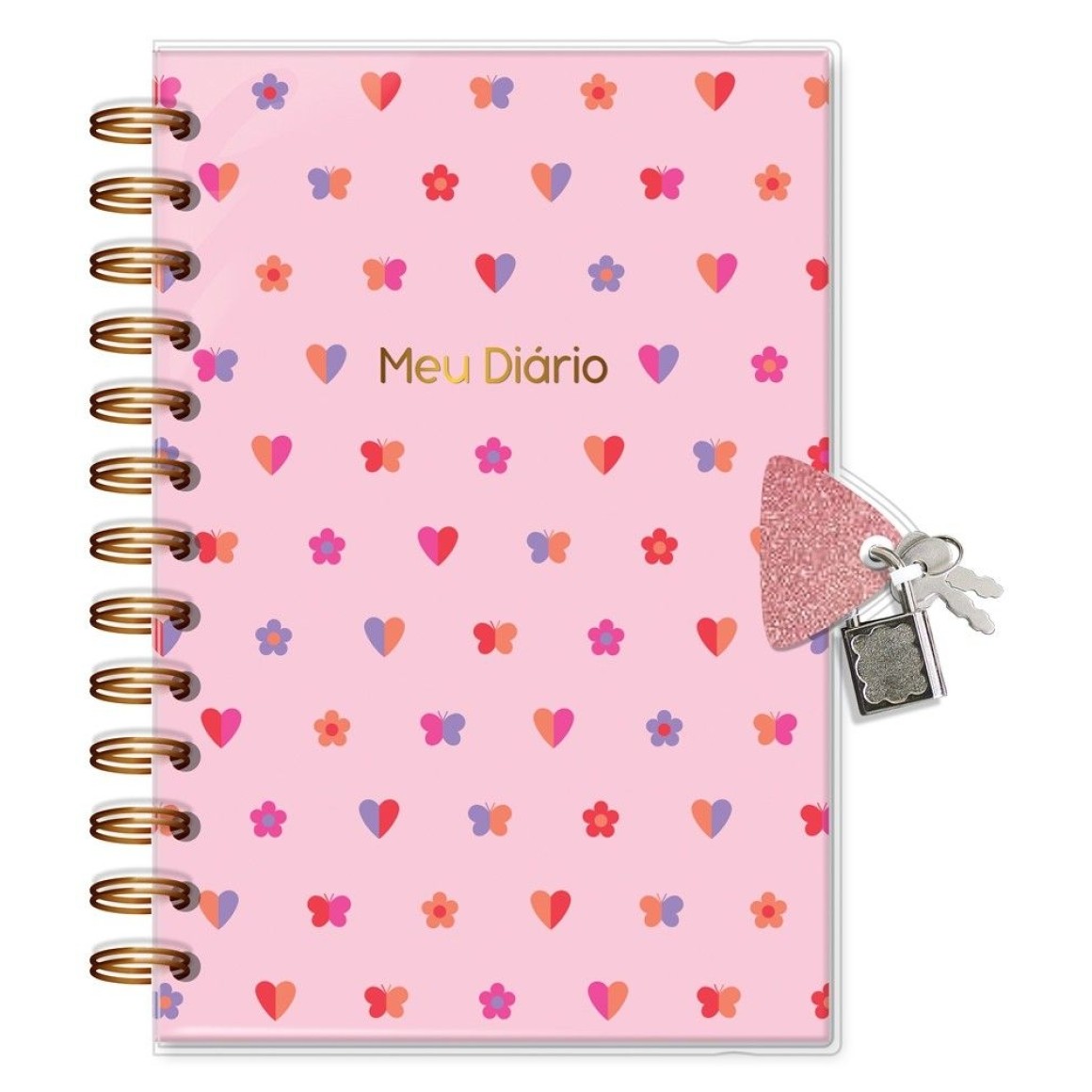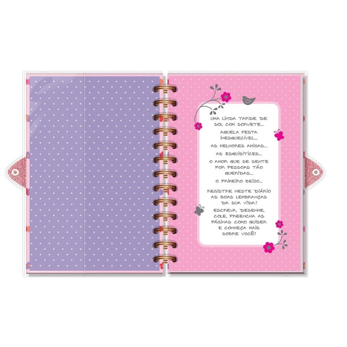 Todas as anotações e segredos bem guardados! Diário com chave, capa dura, miolo pautado e decorado com 84 folhas em papel offset 90g (você pode usar canetas coloridas que não passam para o outro lado), formato 11,8x17,5cm, encadernação wire-o, cadeado de metal com 2 chaves para fechamento. Acompanha capa protetora.