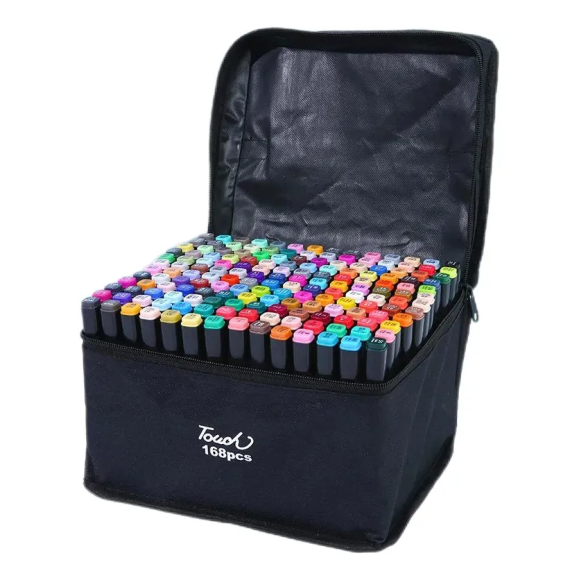 Contem no kit marcadores de ponta dupla, totalizando pontas, os marcadores são a base de álcool e não contém cheiro, ideal para crianças.