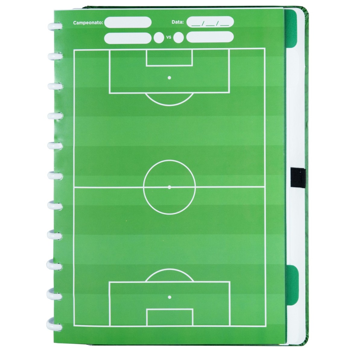 O que contém: Capa e contracapa rígidas, 01 bolsa plástica, 01 folha de instrução de uso e manuseio, com refis e acessórios da marca disponíveis no verso, 01 folha de identificação com calendário no verso, 04 divisórias com abas para identificação (02 verdes e 02 brancas). 80 folhas offset 90g (60 Folhas Pautadas com logo do time e 20 folhas lisas brancas para impressão)