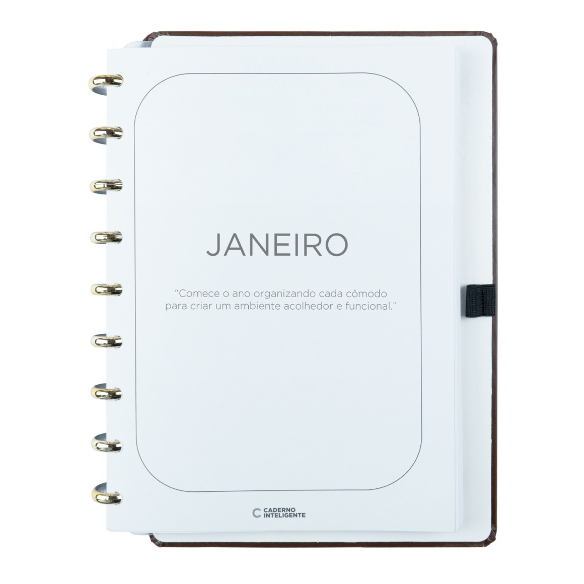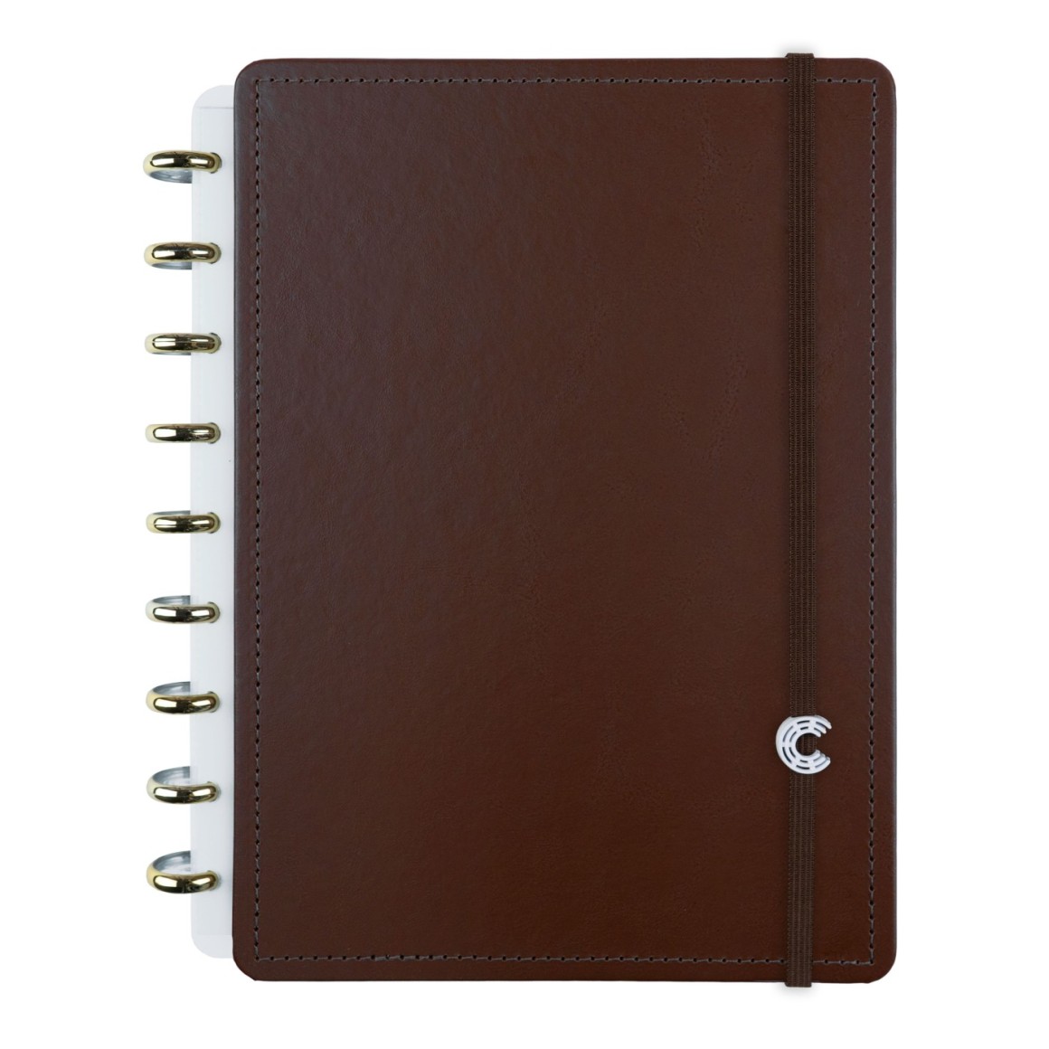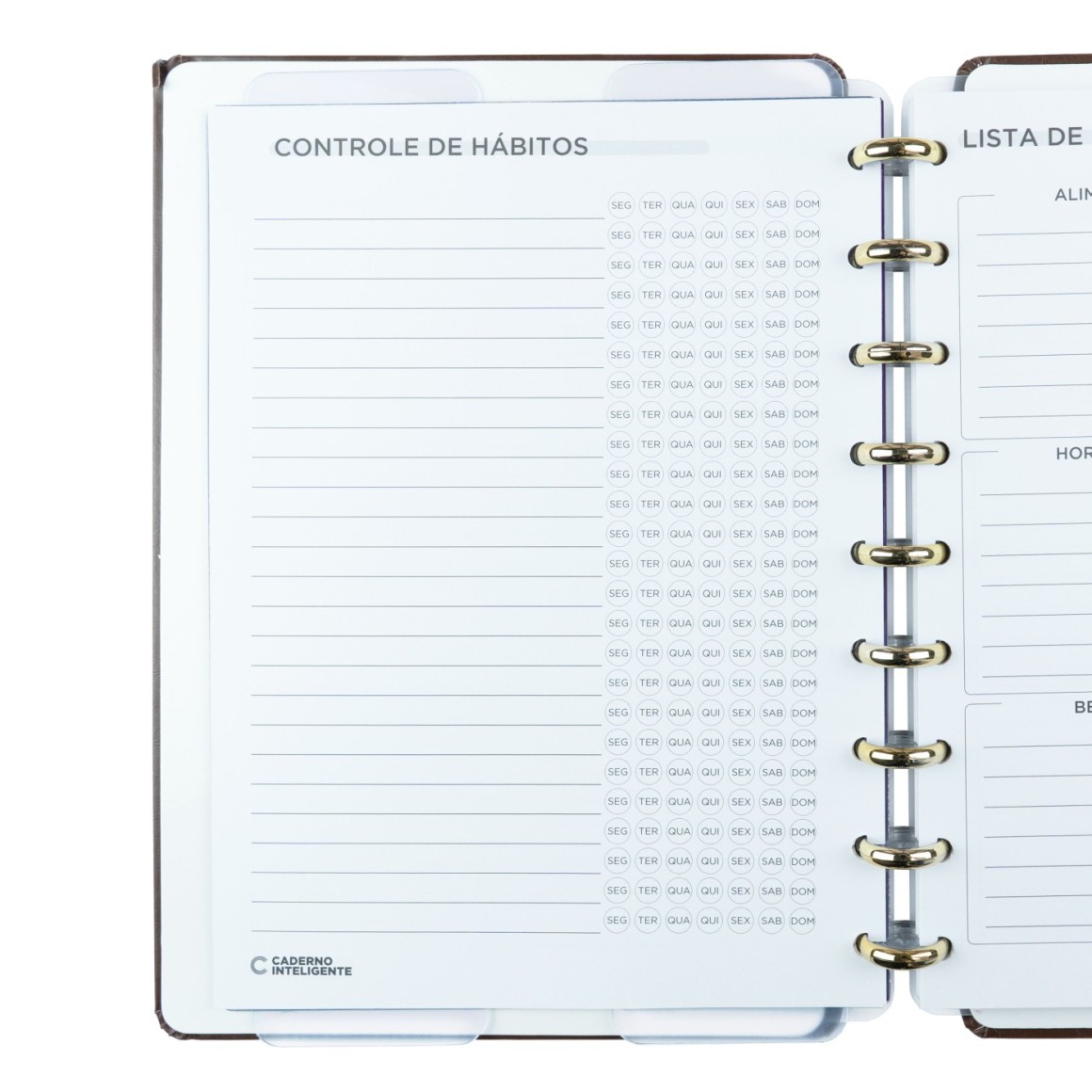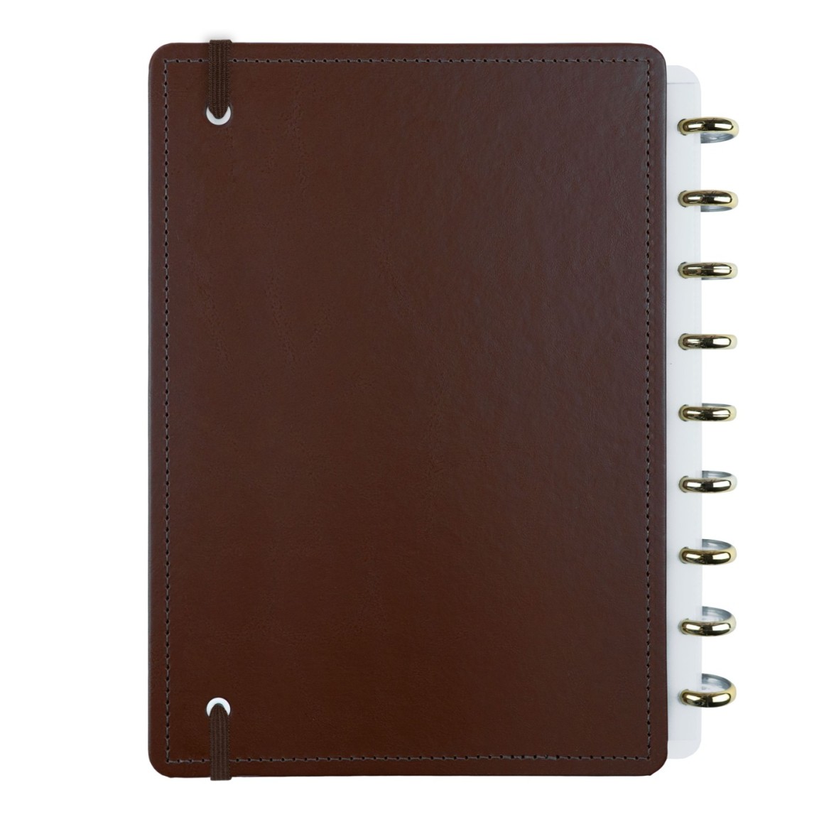Aliando beleza a praticidade, possui capa rígida em tom marrom escuro e discos metalizados na cor dourada.