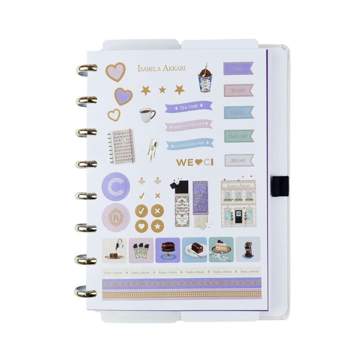 A5 e Médio: Capa e contracapa rígidas, 01 folha de adesivos exclusivos, 01 bolsa plástica, 01 folha de instrução de uso e manuseio, com refis e acessórios da marca disponíveis no verso, 01 folha de identificação com calendário no verso, 01 folha de apresentação Isabela Akkari, 01 folha de receita Isabela Akkari, 01 folha para anotação de receita, 04 divisórias com clean (02 transparentes e 02 branco gelo) abas para identificação localizadas nas partes superior e inferior, 80 folhas offset 90g (60 folhas pautadas e 20 folhas lisas brancas para impressão), 01 suporte com elástico para 01 caneta ou 01 lápis e discos M + elástico.