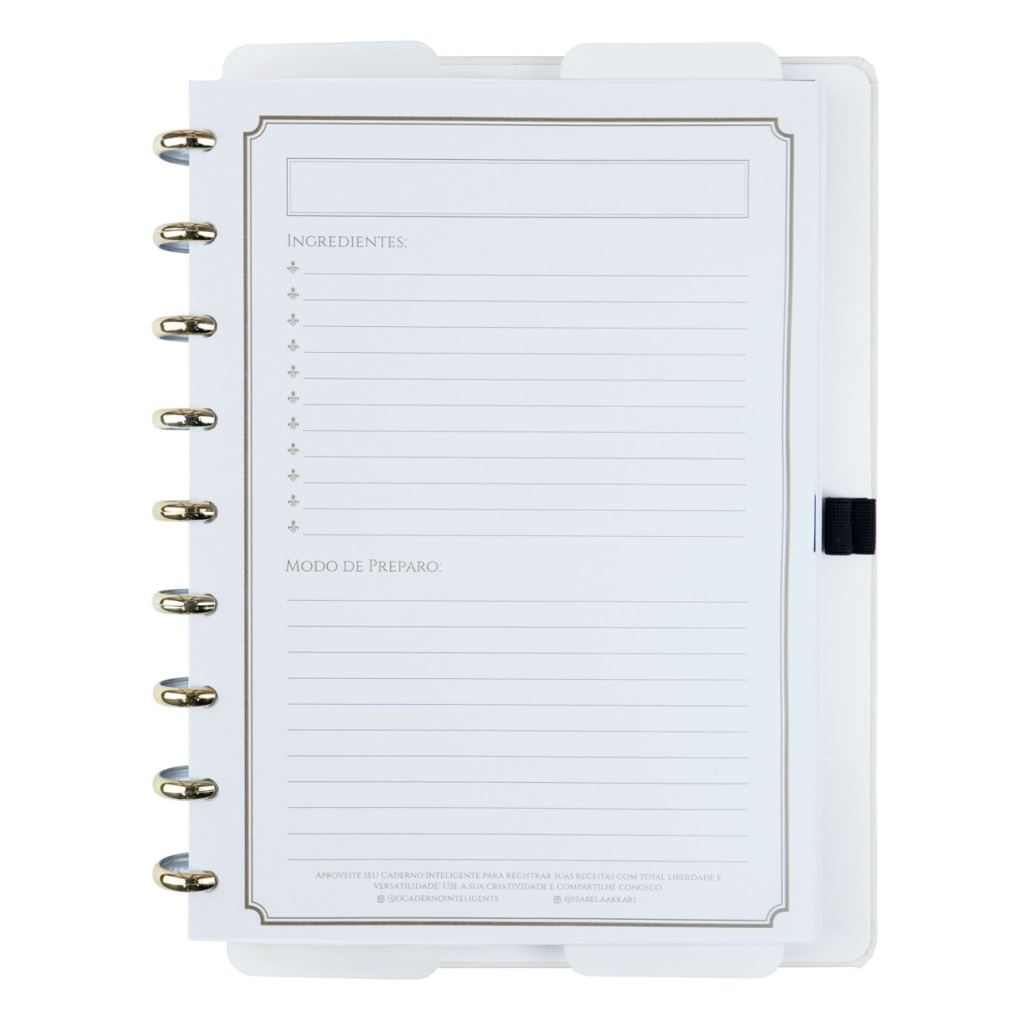A5 e Médio: Capa e contracapa rígidas, 01 folha de adesivos exclusivos, 01 bolsa plástica, 01 folha de instrução de uso e manuseio, com refis e acessórios da marca disponíveis no verso, 01 folha de identificação com calendário no verso, 01 folha de apresentação Isabela Akkari, 01 folha de receita Isabela Akkari, 01 folha para anotação de receita, 04 divisórias com clean (02 transparentes e 02 branco gelo) abas para identificação localizadas nas partes superior e inferior, 80 folhas offset 90g (60 folhas pautadas e 20 folhas lisas brancas para impressão), 01 suporte com elástico para 01 caneta ou 01 lápis e discos M + elástico.