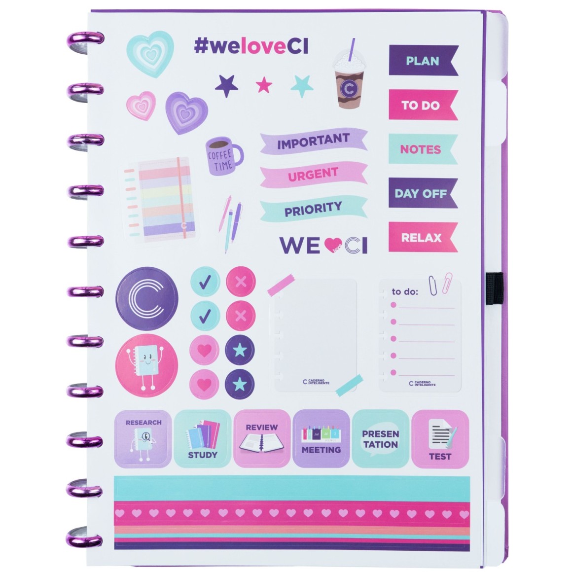 Inteligine: Capa e contracapa rígidas, 01 folha de adesivos, 01 folha de instrução de uso e manuseio, com refis e acessórios da marca disponíveis no verso, 01 folha de identificação com calendário no verso, 50 folhas Lisas Offset 120g e 01 suporte com elástico para 01 caneta ou 01 lápis e discos M + elástico.