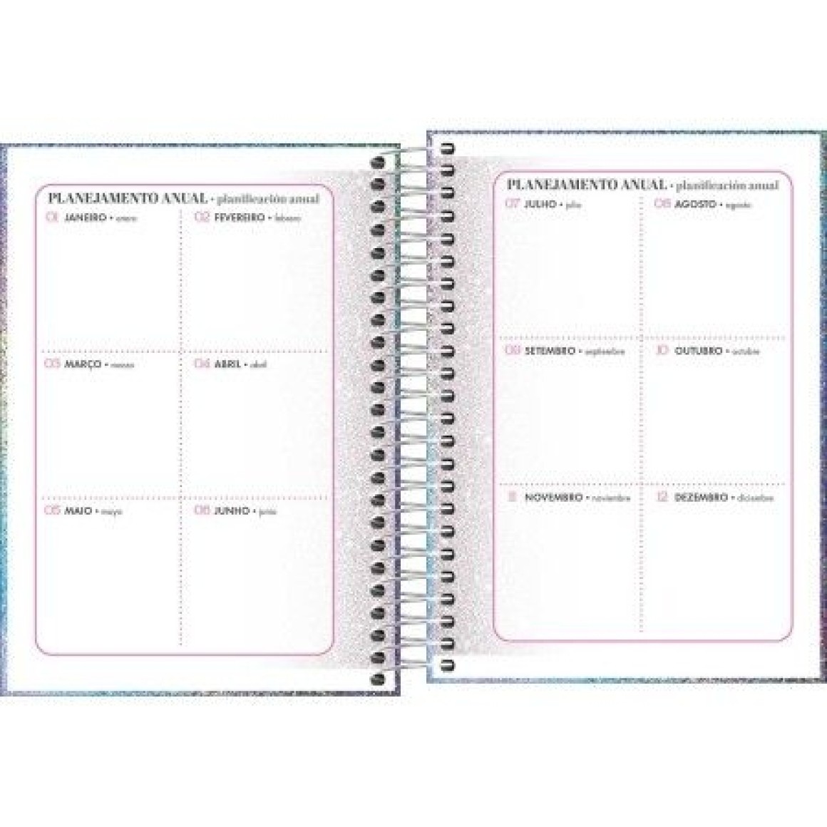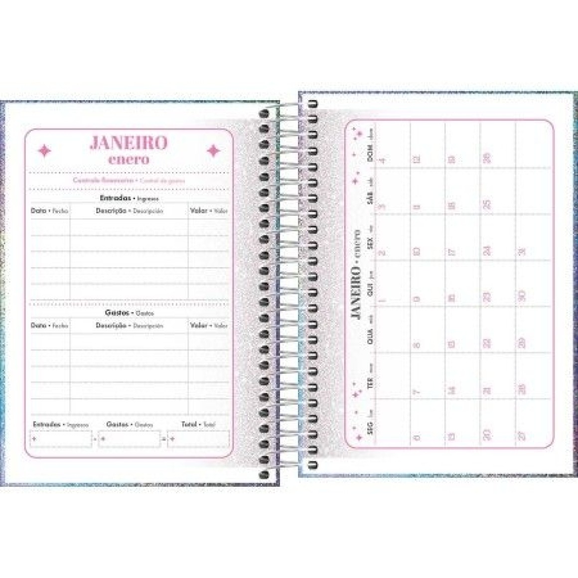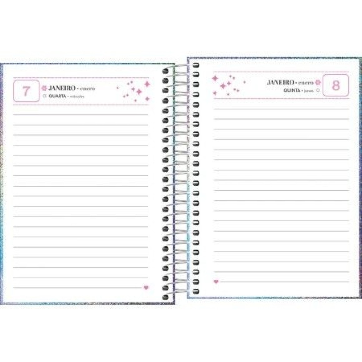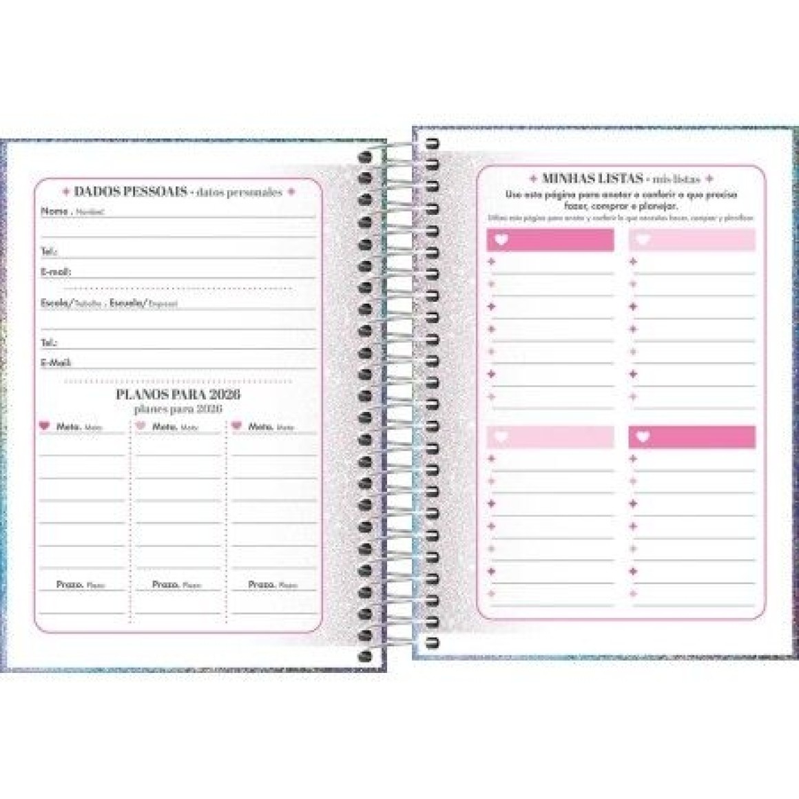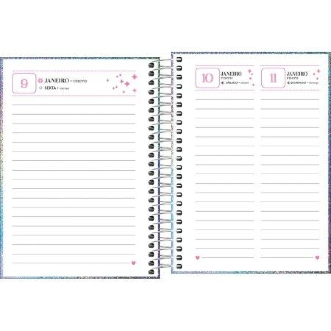 A Agenda Espiral Diária 11,7 x 16,4 cm Glow 2026 com visão de 1 dia por página, exceto sábado e domingo, possui capa dura com material especial brilhante, acabamento em espiral branco e bolsa de papel decorada para guardar trabalhos e anotações. Ideal para a organização do dia a dia.