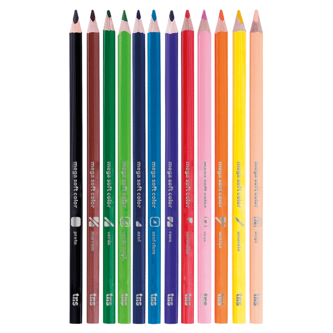Cores vibrantes! Lápis de madeira, de traço super macio, excelente cobertura e corpo triangular. 12 cores!
