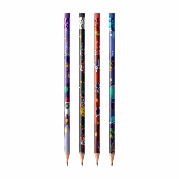 Os lápis Collection possuem estampas divertidas e são super colecionáveis. Inspiradas no universo intergaláctico, o lápis grafite Astro tem 4 estampas, corpo redondo, espaço para colocar o nome e borracha colorida no topo.